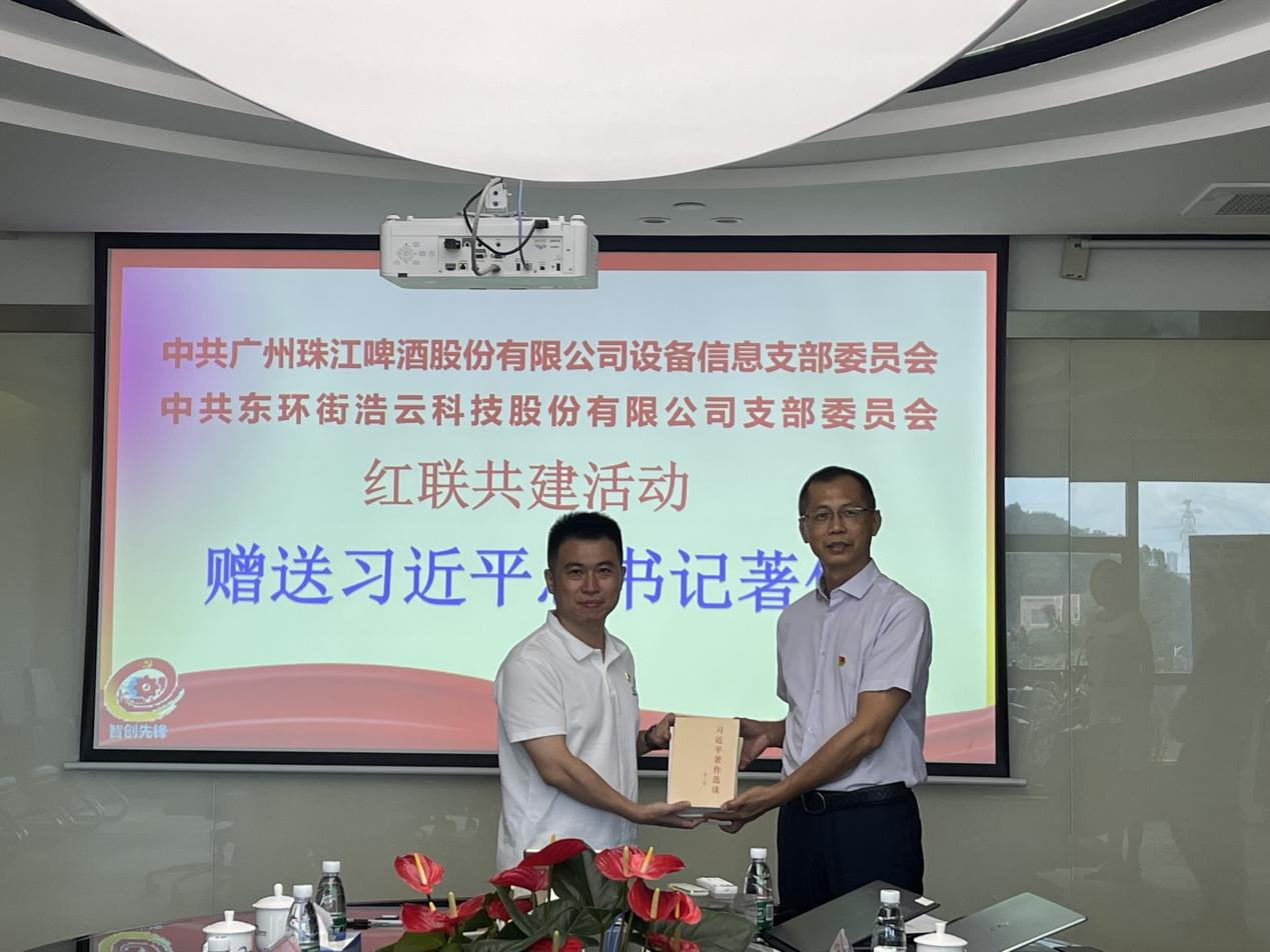 曾海濤總會計師代表設備信息黨支部向浩云科技黨支部贈送習近平總書記著作及相關學習讀本,并提出兩個黨支部要以簽訂共建協(xié)議為契機,深入學習貫徹習近平新時代中國特色社會主義思想,充分發(fā)揮共建雙方優(yōu)勢,定期交流黨建工作經(jīng)驗,互學互促,共同提高黨建工作水平。同時希望借力浩云科技在計算機信息系統(tǒng)集成、物聯(lián)網(wǎng)智能化工程等方面的技術優(yōu)勢,在珠江啤酒智能制造和綠色化工廠的基礎上,搭建未來雙主業(yè)高質(zhì)量發(fā)展共享平臺,通過黨建與業(yè)務聯(lián)建,共同解決關鍵核心技術問題等任務,將黨建互促互進的政治優(yōu)勢將更好地轉(zhuǎn)化為發(fā)展優(yōu)勢,進一步推動企業(yè)高質(zhì)量發(fā)展取得新成效、再上新臺階。